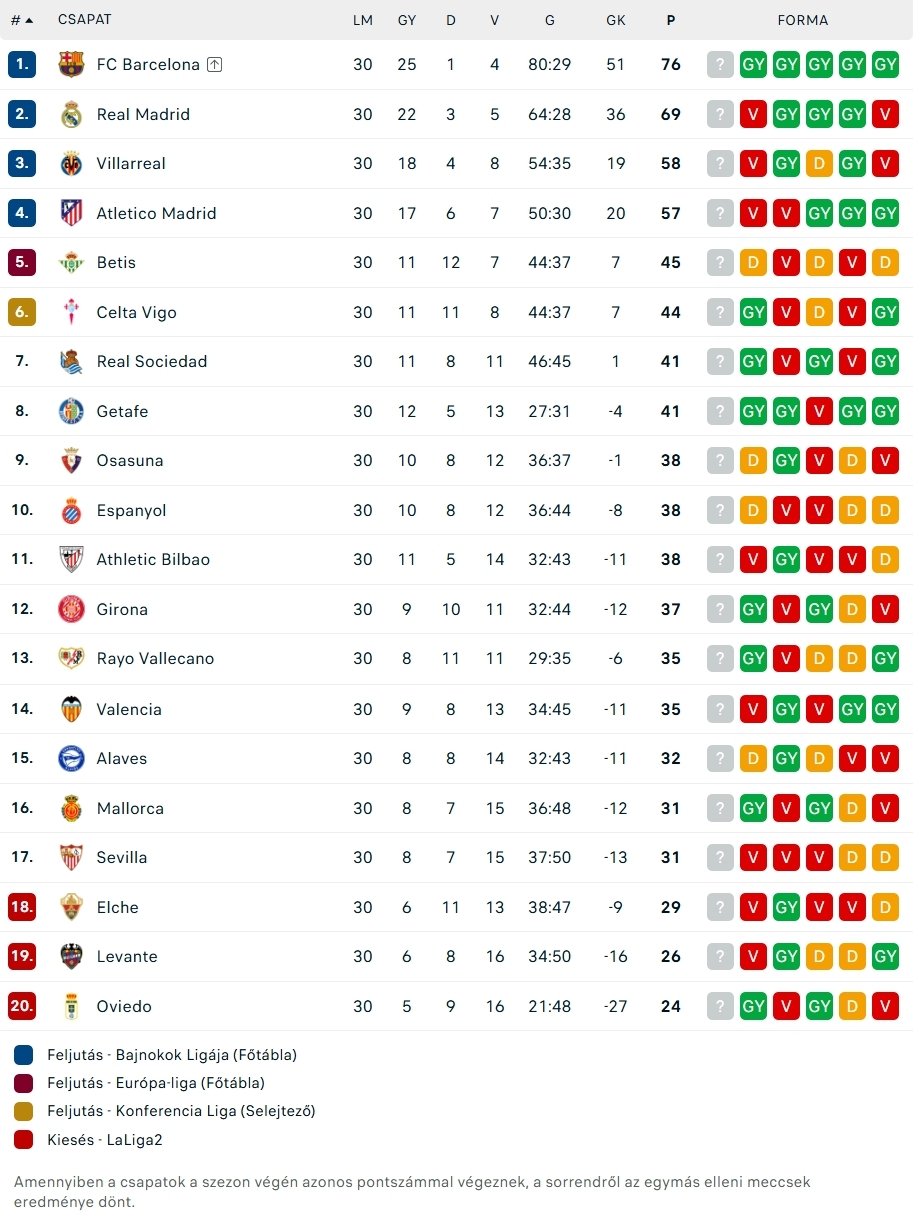 2025-2026-os La Liga szezon tabellája (a frissítés mindig az utolsó mérkőzést követő napon történik meg):
